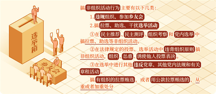 《中国共产党纪律处分条例》第八十二条、第八十三条对搞非组织活动行为列出负面清单,对违规组织、参加乡友会,以及搞拉票、助选、干扰选举活动作出处分规定。1.违…