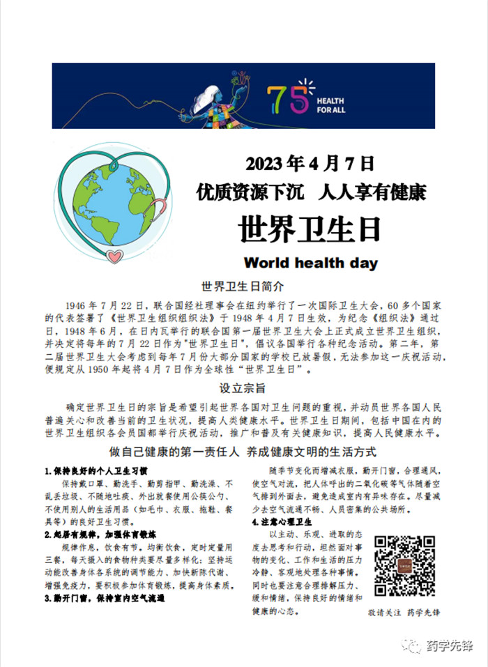 今年的4月7日是第75个世界卫生日,今年的主题是“优质资源下沉 人人享有健康”。为提高药学生对卫生健康工作的关注,守护我院广大师生的身心健康,药学系文明监督…