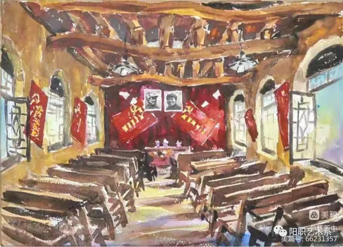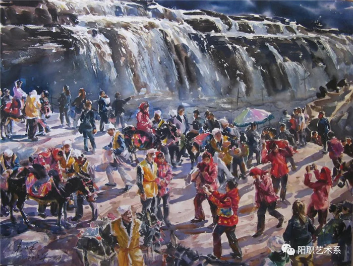 宫老师的水彩画创作是在勤于学习、思考中不断完善,实践创新,他学过美国本土画家安德鲁·怀斯的细腻技法,学过英国画家约翰·亚德利的写意风格,学过美国水彩大师萨金特的潇洒精神,最后还是回到中国画传统的写意精神上来。他五十多岁后创作的题材有了很大变化,从原来的乡土小情调变成了社会大主题及革命历史主题上来了,他的写意精神也随之越发体现出来。比如他画的《黄河大集》《沸腾的小山村》《刀马旦》等作品用笔干净老辣、气势磅礴、生机盎然、有度有势,游于象外的超旷空灵、画面的勃勃生机,尽显中国式写意水彩画的独特魅力。